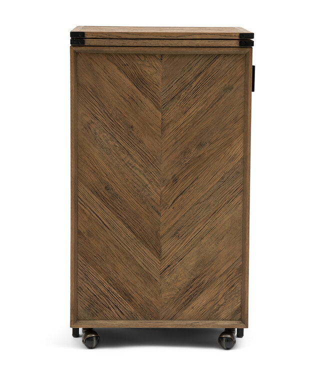 De Portella-wijnkast is een parel voor thuis met zijn prachtige visgraatpatroon parket inleg. Gemaakt van mooi hergebruikt eikenhout en ijzer, is deze uitklapbare wijnkast zeer functioneel. De afmetingen ingeklapt zijn 53x49x94 cm en uitgeklapt 106x49x94 cm. De wielen onder het uitklapbare gedeelte maken het eenvoudig om het om te toveren tot een bar en het past zeker in elk interieur. Een uniek meubelstuk dat je wijnverzameling laat stralen!