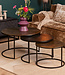 De salontafelset Xaro bestaat uit drie salontafels met bladen van aluminium. De grote en kleine tafel hebben een gouden afwerking, terwijl het middelste tafeltje een zwarte afwerking heeft. De frames van de tafels zijn vervaardigd uit ijzer met een zwarte coating. Afmetingen: - Grote tafel: 75 cm (b) x 75 cm (d) x 45 cm (h) - Middelste tafel: 60 cm (b) x 60 cm (d) x 45 cm (h) - Kleine tafel: 50 cm (b) x 50 cm (d) x 35 cm (h) Onderhoudsinstructies: Reinigen met een licht vochtige doek.