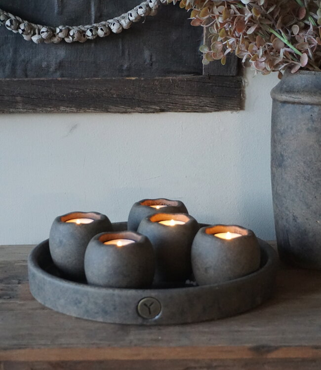 Breng warmte en elegantie in huis met de set van 5 theelichthouders op schaal majestic brown van Brynxz. De kleine, ronde houders passen perfect op de bijgeleverde schaal en creëren samen een sfeervol geheel. Ideaal als centerpiece op je tafel, dressoir of schouw.