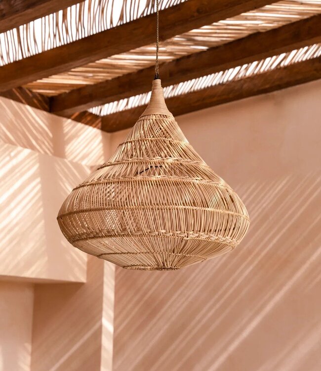 The Drop Pendant är en handvävd rattanlampskärm formgiven som en elegant droppe. Den lagerbyggda vävtekniken och den skulpturala siluetten skapar ett varmt, organiskt uttryck som förhöjer inredningen, oavsett om den hängs i taket eller används som dekorativ golgarnityr. Finns i tre storlekar och sprider ett mjukt, texturerat ljus som omedelbart höjer atmosfären i rummet. Lampskärmen levereras utan elanslutning (kabel eller stickkontakt) vilket ger frihet att välja önskat takkopp, takfäste eller plug-in-armatur — dessa tillbehör säljs separat i vårt sortiment. Produktinformation: Produkttyp: Takpendel. Färg: Naturlig. Material: Rattan. Ursprung: Indonesien.