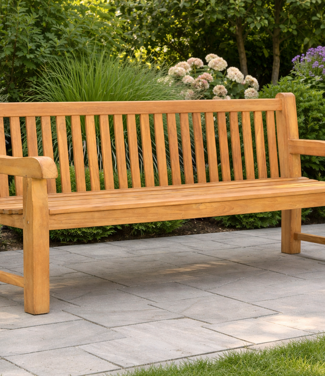 Parkbank van teakhout Afmetingen: 210 x 70 x 92 cm Beschrijving Elegant en duurzaam vormgegeven parkbank, vervaardigd uit hoogwaardig teakhout. Het robuuste model biedt comfortabele zitplaatsen en is uitermate geschikt voor tuin, terras of openbare ruimtes. Teakhout combineert natuurlijke weerbestendigheid met een lange levensduur; regelmatig onderhoud behoudt de uitstraling en functionaliteit. Let op Door schommelingen in temperatuur en luchtvochtigheid kunnen er krimpscheuren in het hout ontstaan. Dit is een natuurlijke eigenschap van massief hout en heeft geen invloed op de structurele sterkte of duurzaamheid van het meubel.