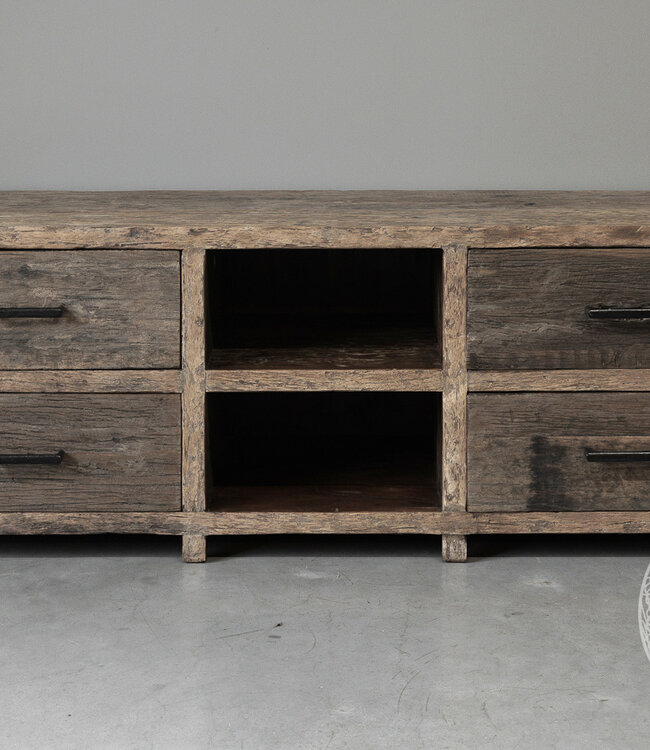 Dit prachtige tv-meubeltje is prachtig om te zien. Het meubel heeft een subtiele afmeting van 60 cm hoog, 160 cm lang en 50 cm diep. Het dressoir komt uit de Limited Edition collectie! Door het oude hout en de zwarte handgrepen zorgen voor een stoere en landelijke uitstraling.
