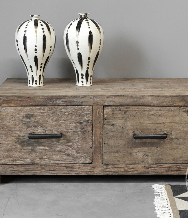 Dit houten tv-meubel combineert natuurlijke warmte met slimme opbergruimte. Het heeft twee open vakken voor apparaten of decoratie en één lade voor spullen die je uit het zicht wilt houden. Het massieve hout geeft karakter en duurzaamheid aan je woonkamer.