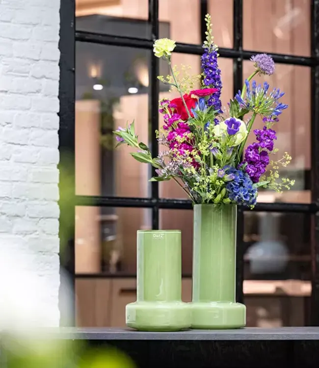 Deze glazen vaas is in een maat verkrijgbaar en het is een geschikte maat voor de vensterbank, sidetable, keukentafel, woonkamertafel, salontafel, badkamer, slaapkamer en keuken. DutZ collection heeft veel glazen vazen in de collectie in verschillende kleuren. Dit model is een klassieker in de collectie en perfect met tulpen, veldboeket of een rozenboeket. DutZ vazen passen in elk interieur.
