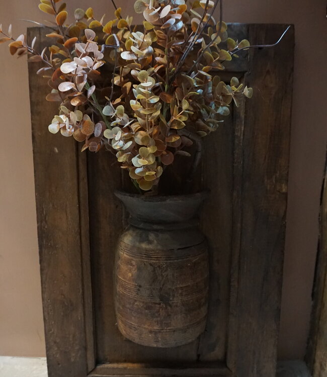 Uniek wandpaneel met rustieke uitstraling een authentieke houten lijst met centraal een karaktervolle kruik. De warme doorleefde afwerking geeft direct sfeer aan elk interieur. Perfect als blikvanger in woonkamer hal of slaapkamer.