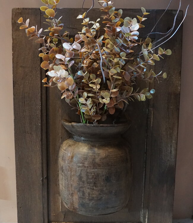 Uniek wandpaneel met rustieke uitstraling een authentieke houten lijst met centraal een karaktervolle kruik. De warme doorleefde afwerking geeft direct sfeer aan elk interieur. Perfect als blikvanger in woonkamer hal of slaapkamer.