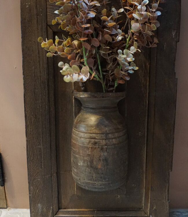 Uniek wandpaneel met rustieke uitstraling een authentieke houten lijst met centraal een karaktervolle kruik. De warme doorleefde afwerking geeft direct sfeer aan elk interieur. Perfect als blikvanger in woonkamer hal of slaapkamer.