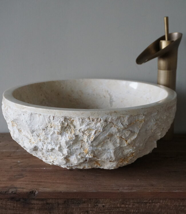 Breng pure luxe en natuurlijke charme in je badkamer met deze unieke marmeren waskom. Met zijn ruwe, gekapte buitenkant en glad gepolijste binnenzijde is deze waskom een echte eyecatcher op ieder badkamermeubel. Geen enkele kom is exact hetzelfde — de natuurlijke aders en kleurverschillen maken elke waskom tot een uniek en exclusief stuk natuursteen.