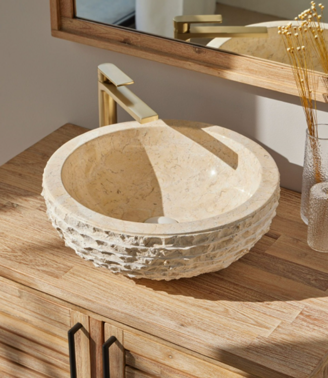 Deze ronde hoogwaardige marmeren waskom is op traditionele wijze uit de massa gehouwen en is gemaakt van 100% natuursteen. De buitenkant is gekapt/geribbeld, de binnenkant is glad en gepolijst. Edel en duurzaam materiaal en voorzien van een afvoergat van 4,5 cm (Europese norm).
