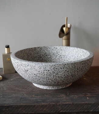 Deze unieke waskom past perfect in een moderne badkamer. De waskom heeft twee kleuren, zwart en wit en is gemaakt van terrazzo. Terrazzo is niet hetzelfde als natuursteen of marmer maar zit er een beetje tussenin. Een andere benaming voor terrazzo is ‘granito.’ Het karakter van terrazzo past in verschillende stijlen. Deze waskom heeft een diameter van 40 cm en heeft een hoogte van 15 cm. Altijd gratis levering aan huis in NL & BE!