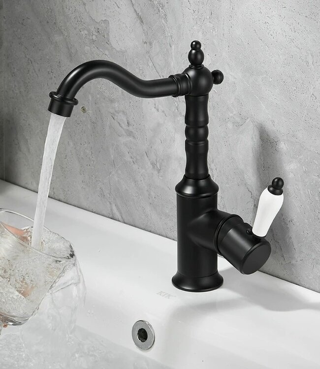Deze klassieke wastafelkraan in zwart geeft de badkamer of keuken een elegante, tijdloze uitstraling. De sierlijke uitloop, verfijnde details en de porseleinen hendel zorgen voor een authentieke landelijke stijl met een luxe afwerking.