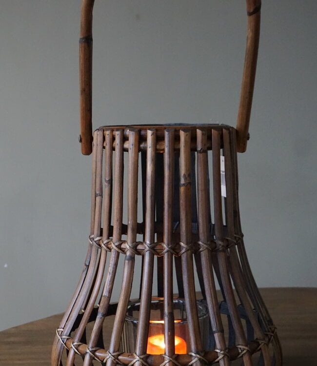 Onwijs gave rattan lantaarn in een naturel/donker grijze afwerking! De lantaarn is 45 cm hoog en 34 cm diep. Ook leuk als setje met een mooie stompkaars er in. Ideaal voor de donker wordende avonden. Gezellig en sfeervol! Inclusief glazen kaarshouder, exclusief kaars.