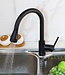 Moderne zwarte keukenkraan met een handige uittrekbare sproeikop. Deze kraan combineert stijl en functionaliteit met twee standen (straal en douche) en een zwenkbare uitloop. Dankzij de keramische schijven is de bediening soepel en duurzaam, perfect voor dagelijks gebruik.